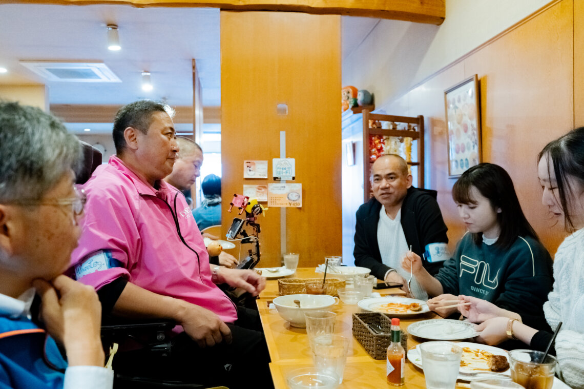 A班はroom’sで昼食をとりながら、飯島さんの日頃の外出事情についてなど話が弾んだ。電動車いすの装備や価格に興味を持って尋ねる人もいた。