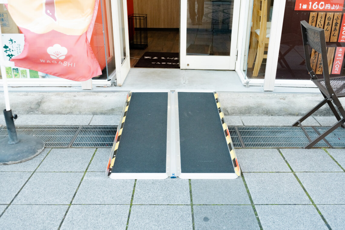「手動の車いすは介助者が前輪を持ち上げたりして人力でどうにかできますが、私のようなフル電動車いすの場合は重量が170kg近くあるので、抱えることは難しく、6〜7cmほどのちょっとした段差も乗り越えられません。そんな時、入り口にスロープがかかっていれば入店できるようになり、状況は大幅に改善されます。高齢の介助者の場合なども、スロープがあれば持ち上げる負担が減りますし、ベビーカー利用者も使えます」