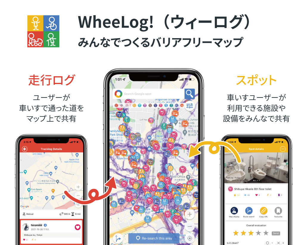 代表の織田友理子さんは大学時代に進行性の筋疾患を発症し、車いす生活になった後に結婚・出産した。子どもを連れて海水浴に行きたいと思い続けていたところ、偶然ネットで大洗にバリアフリーの海岸があると知り、家族で出かけることができた。「情報」が車いすユーザーの世界を変え、心を豊かにすると感じた自身の体験から、みんなで作るバリアフリーマップ「WheeLog!」を発案。