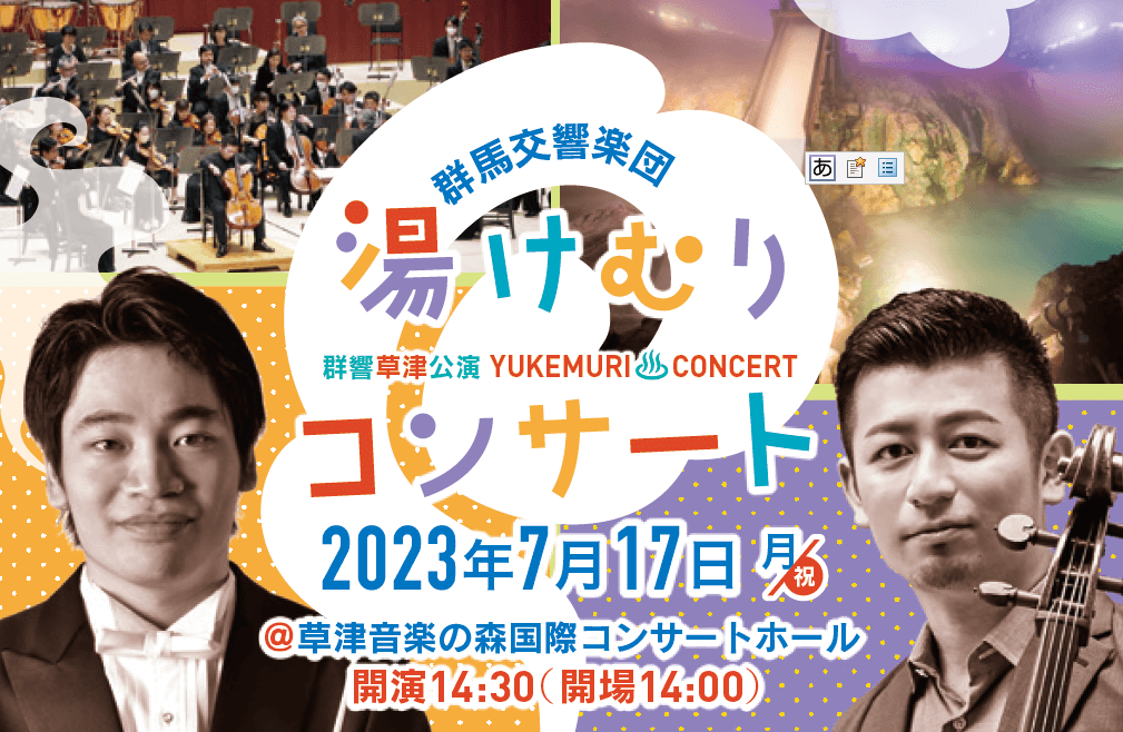 今年度第一段として、日本有数の温泉地「草津温泉」において、26歳でN響デビューし、現在ドイツを拠点に活動を続けている指揮者・熊倉優と最も有名なチェリストの一人、宮田大が共演する「湯けむりコンサート」を開催します。 草津の豊かな自然の中で、本格クラシック・コンサートをぜひお楽しみください!